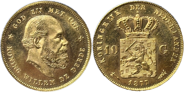 Des monnaies dans un de conservation fréquemment haut, il n’est pas rare de voir des monnaies superbes voir splendides. Nous pouvons ici apprécier la production hollandaise par la monnaie royale des Pays-Bas dans sa coupure de 10 florins ou gulden à l’effigie de Willem III.