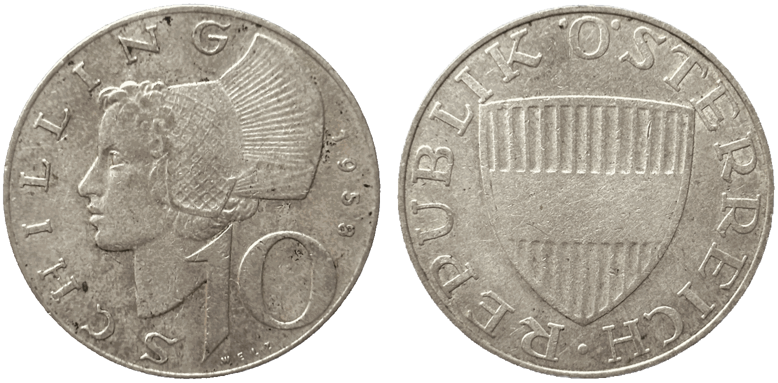 Frappées par la Münze Österreich (Monnaie de Vienne), ces pièces de 10 Schilling en argent 640 ‰ ont été émises sous la Deuxième République autrichienne entre 1957 et 1973. Le revers présente le célèbre portrait de la Femme du Wachau, coiffée du Goldhaube, la coiffe traditionnelle de Basse-Autriche, gravée par Ferdinand Welz.