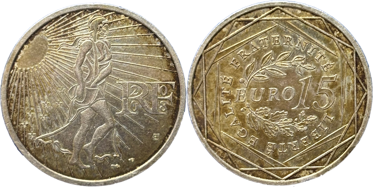 Des monnaies dans un état de conservation au minimum très très bien. Monnaie à la semeuse stylisée de 2008. En argent 900% millièmes. Dans sa coupure de 15 euros et ses 15 grammes.