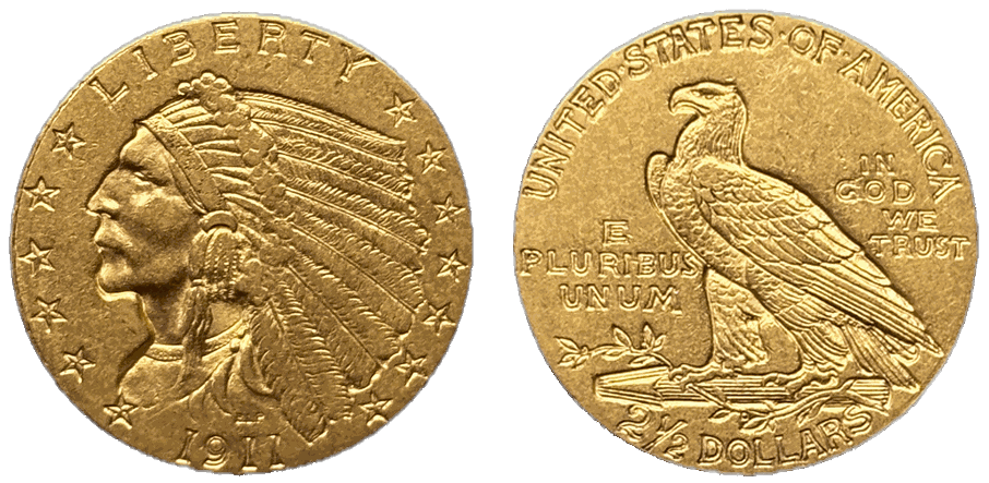 Frappée en 1911 à l’atelier de Philadelphia, cette pièce de 2½ Dollars en or appartient à la série Indian Head Quarter Eagle, produite de 1908 à 1929. Cette série est née de la volonté du président Theodore Roosevelt de moderniser le monnayage américain au début du XXe siècle. Le sculpteur bostonien Bela Lyon Pratt, élève d’Augustus Saint-Gaudens, créa un design unique dans l’histoire numismatique des États-Unis : une frappe en creux, c’est-à-dire avec les motifs creusés dans le flan plutôt qu’en relief, contrairement à toutes les autres monnaies de circulation américaines. Ce choix audacieux suscita la controverse à l’époque, certains craignant — à tort — que les creux ne retiennent des germes.