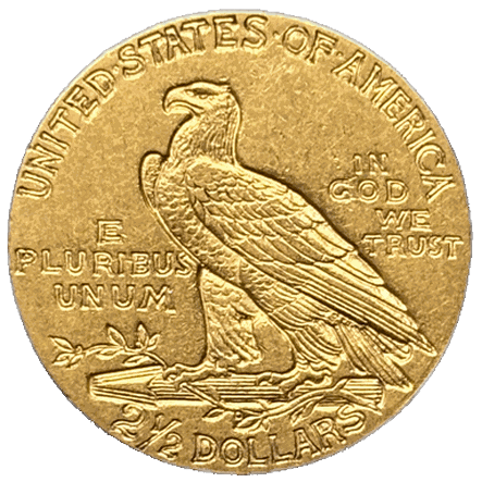 Le revers figure un aigle américain debout, les ailes repliées, posé sur un faisceau de flèches enveloppé d’une branche d’olivier — symboles traditionnels de la puissance militaire et de la paix. Les inscriptions « UNITED STATES OF AMERICA » et « E PLURIBUS UNUM » entourent le motif, tandis que la devise « IN GOD WE TRUST » apparaît à droite de l’aigle. La valeur faciale « 2½ DOLLARS » est indiquée en partie basse. Ce revers, lui aussi frappé en creux, renforce le caractère unique de cette émission dans le monnayage mondial.