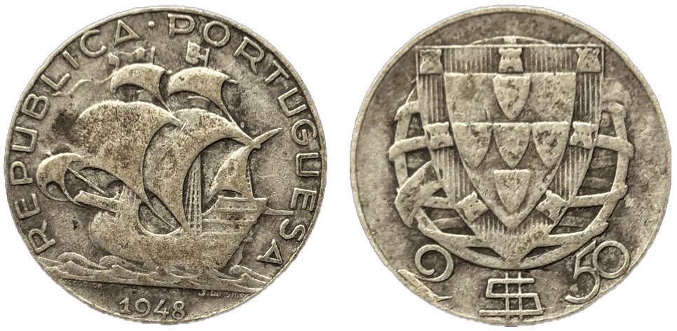 Frappées par la Casa da Moeda de Lisbonne, ces pièces de 2,50 Escudos en argent 650 ‰ ont été émises sous la République portugaise entre 1932 et 1951. Elles reprennent le même design que les 5 Escudos : l’avers présente une caravelle toutes voiles déployées arborant la croix de l’Ordre du Christ, gravée par João da Silva et Arnaldo Fragoso.