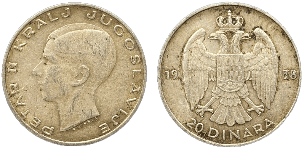 Frappées par la Monnaie de Paris pour le compte du Royaume de Yougoslavie, ces pièces de 20 Dinara en argent 750 ‰ portent le portrait du jeune roi Pierre II (Petar II Karađorđević), monté sur le trône à seulement onze ans en 1934. L’avers présente son buste juvénile tourné vers la gauche avec la légende « PETAR II KRALJ JUGOSLAVIJE ». Le revers arbore l’aigle bicéphale couronné aux armes du royaume, encadrant la date 1938 et la valeur « 20 DINARA ».