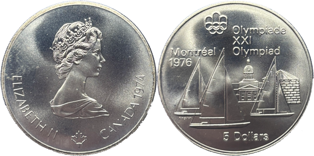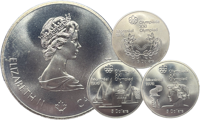 Monnaies canadiennes en argent 925 ‰. Production d’investissement par excellence de la Monnaie Royale Canadienne dans ses millésimes de 1973 à 1976, uniquement à l’effigie de la série commémorative des Olympiades de Montréal.