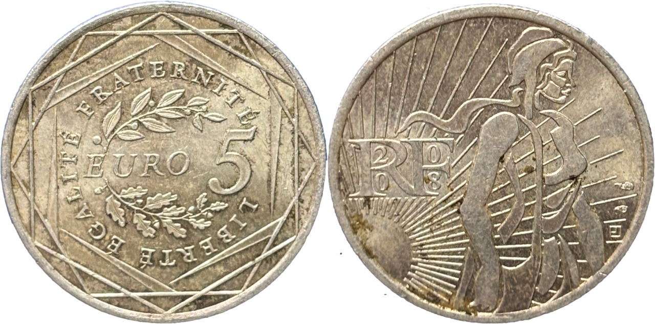 Des monnaies dans un état de conservation au minimum très très bien. Monnaie à la semeuse stylisée de 2008. En argent 500% millièmes.