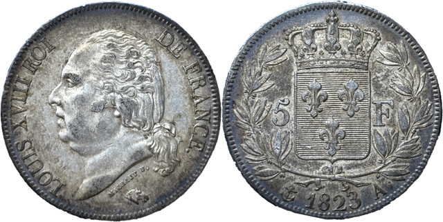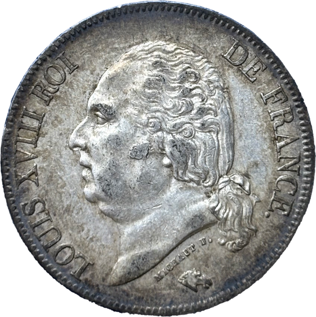 Un très très bel exemplaire d’une monnaie de 5 francs à l’effigie de Louis XVIII dans un état de conservation peu commun pour ce type monétaire. Une superbe patine d’origine, patine de collection aux reflets bleutés argentés avec un reste de brillant de frappe.
