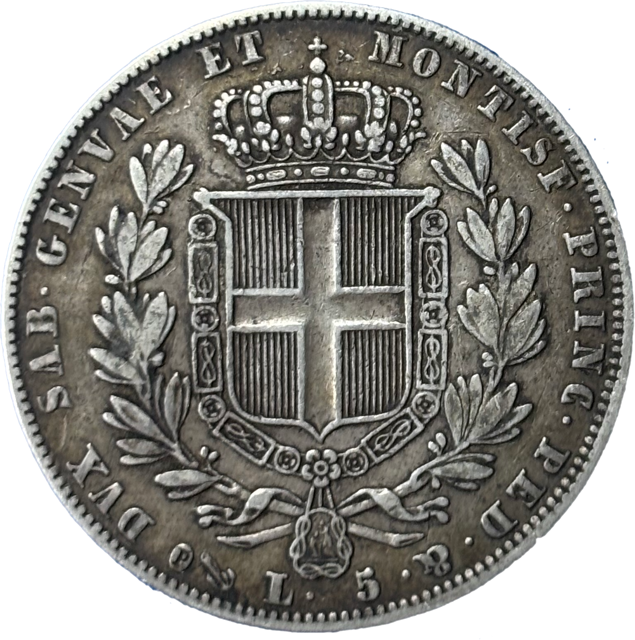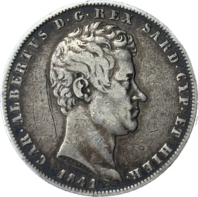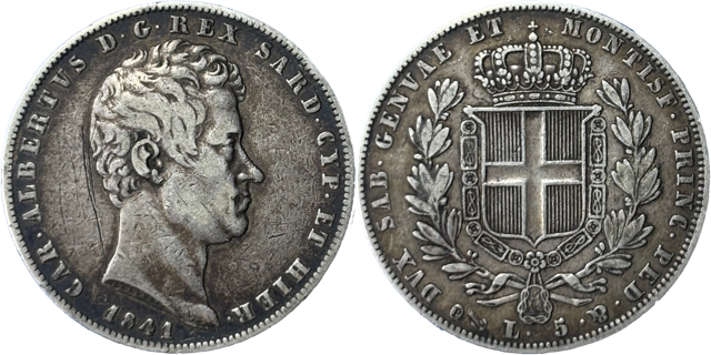 Une très très rare monnaie de 5 lire à l’effigie de Charles Albert ou Carlo Alberto roi de Sardaigne dans un millésime particulièrement rare de 1841 de l’atelier de Gênes. Classée R2 en rareté, il ne faut pas se fier à sa quantité de frappe en inadéquation avec sa fréquence de découverte. En effet cette frappe et d’une rareté toute particulière.
