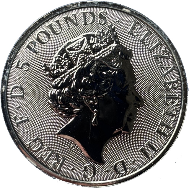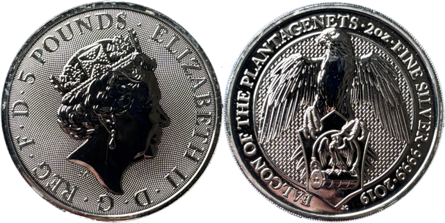 Une 2 onces dans la série « The Queen’s Beasts » à la frappe de qualité BE. Frappe au faucon des Plantagenets.
