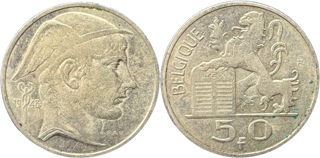 Monnaies de 50 francs belge à la frappe dite au Mercure ou prince Charles aux millésimes selon disponibilités. Monnaies d’un poids de 12,5 grammes pièce à 85% d’argent en font une monnaie d’investissement belge par excellence contenant 10,4 grammes d’argent pur. Les monnaies sont d’une qualité très très belle, de circulation, minimum TTB. Quelques SUP et de belles patines.