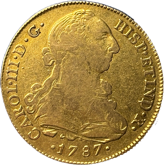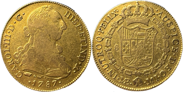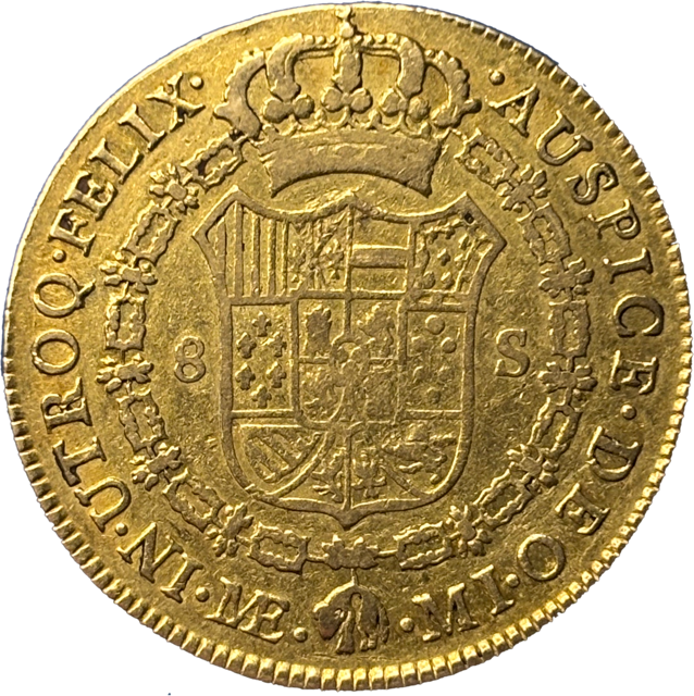 Un très bel exemplaire d’une monnaie exceptionnellement rare du Pérou frappée à Lima et à l’effigie du roi d’Espagne Charles III. Un exemplaire de 8 escudos, la plus grosse coupure de la production. Quasiment 24,7 grammes d’or pur.