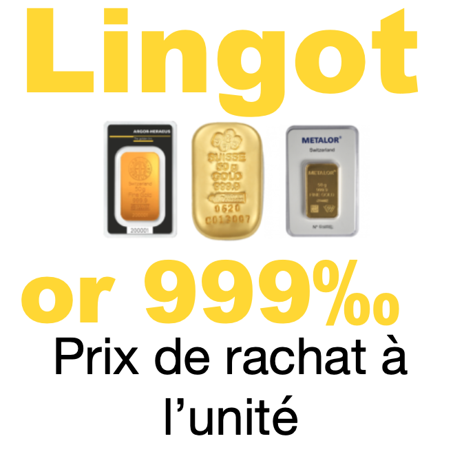 Nous vous proposons de racheter vos lingots et lingotins pour le prix affiché ici par gramme. Si votre lingot fait 10 grammes, multipliez ce prix par 10.